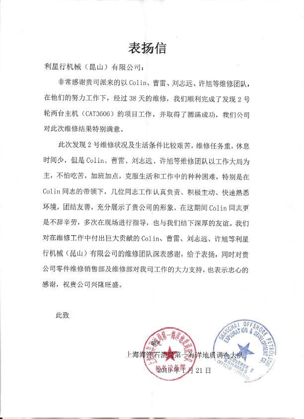 这是一封来自上海海洋石油局的感谢信,他们对金年会·jinnian(金子招牌)信誉至上机械维修团队给予了高度评价,通过向客户提供优质服务,公司也展现出积极主动、团结合作的良好形象,在客户的肯定声中获得双赢。